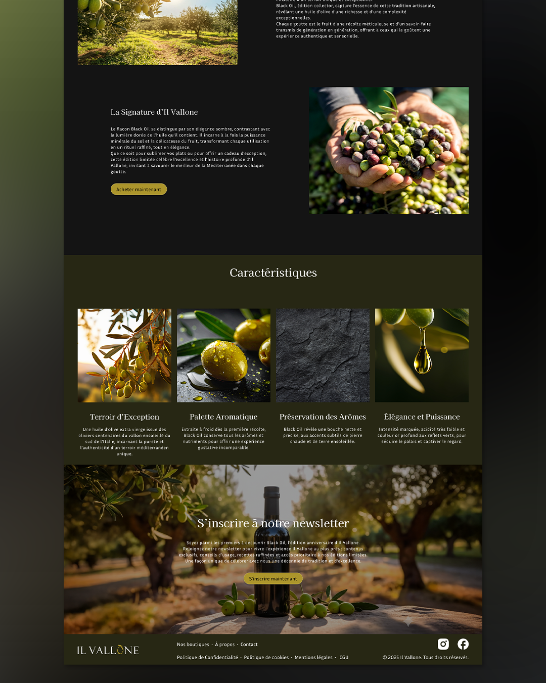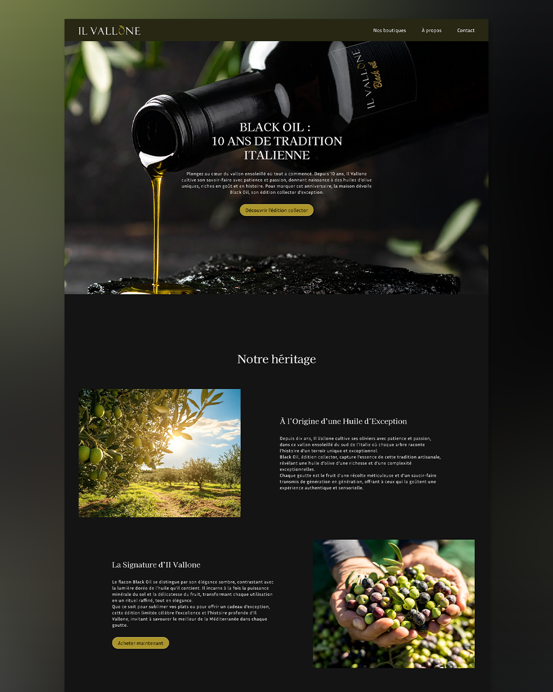 La maison d’huile d’olive italienne Il Vallone célèbre ses 10 ans de récolte et de savoir-faire artisanal. Pour marquer cet anniversaire, la marque souhaite créer une landing page dédiée à sa bouteille collector : Black Oil.